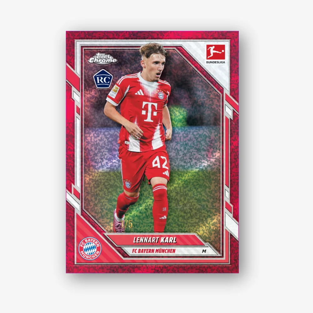 Topps Chrome. Bundesliga returns with a completely new design and a host of new players, featuring many of the biggest stars in European football alongside rising talents and rookies. The Topps Chrome Bundesliga base set, printed entirely on Chrome technology. Rookie Cards are clearly designated with RC markings across base cards and parallels. Among this season’s rookies already making waves are Lennart Karl, Luka Vušković, Yan Diomande, and Saïd El Mala.
