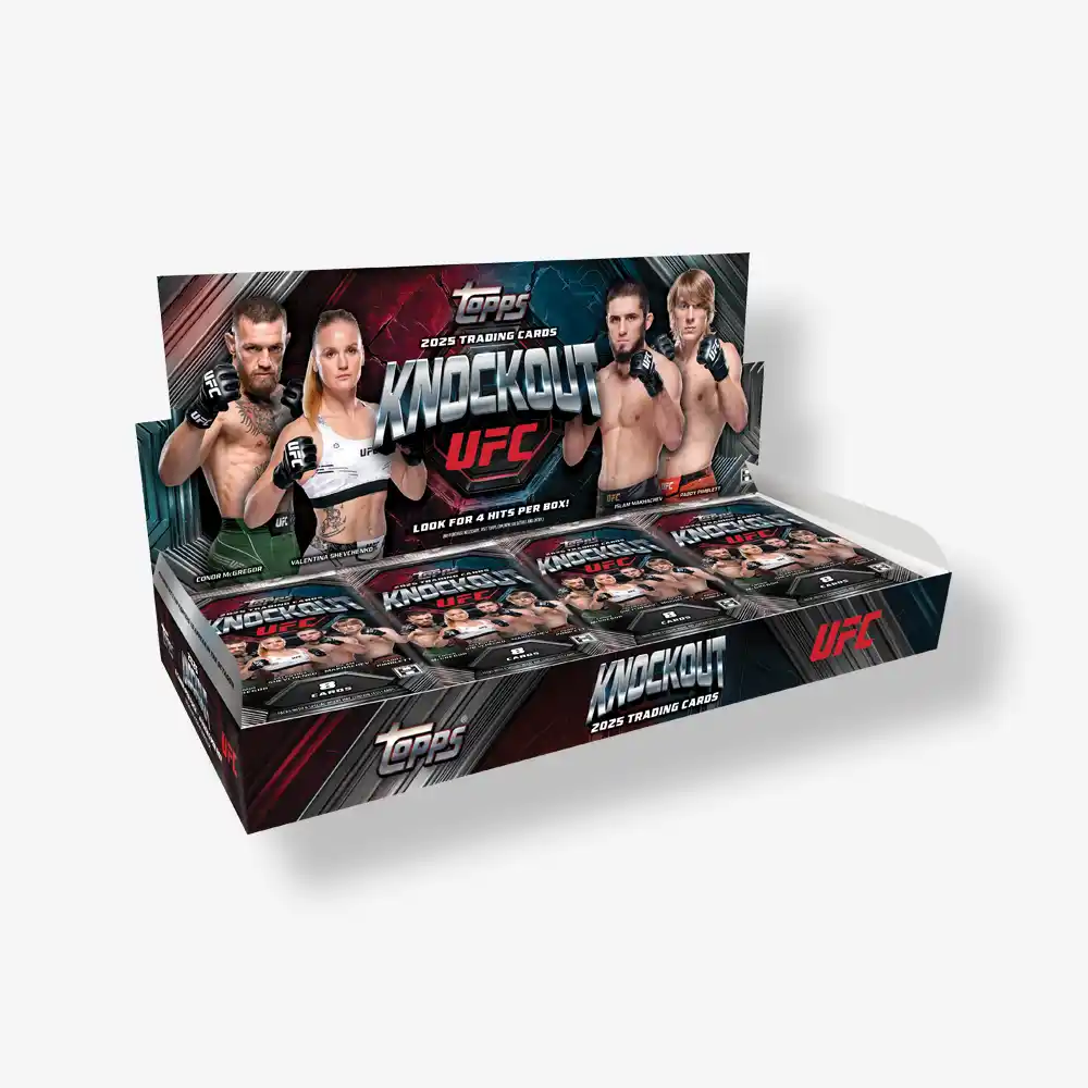 Topps Knockout UFC returns—bringing hard-hitting intensity and Hobby heat. Each box delivers 4 packs with 8 cards per pack, and every box guarantees 3 autographs and 1 relic card. Chase on-card autographs, relics, and booklets from your favorite UFC fighters, including legends, champions, and rising stars. From rare hits to dynamic relic autos, Knockout packs a punch with every rip. Whether you’re collecting for the combat, the craft, or the chase—this one’s for the true fight fans.
