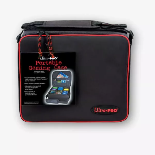 Shoulder bag with an adjustable strap and compartmentalized insert designed to hold collectible cards in Ultra PRO Deck Protector sleeves, deck boxes, and other gaming accessories.